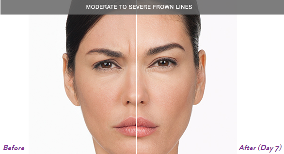 Photos taken at maximum frown and/or full smile before and after treatment with BOTOX® Cosmetic at day 7. In two clinical studies for moderate to severe crow’s feet, 26.1% and 20.3% of people had ≥ 2-grade improvement at day 30. In one of these studies, 67.9% of people had mild or no crow’s feet at day 30 after treatment. In clinical studies for moderate to severe frown lines, physicians assessed 80% of people had significant improvement at day 30.