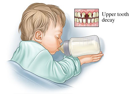 As soon as teeth appear in the mouth, decay can occur. One of the risk factors for early childhood cavities (sometimes called baby bottle tooth decay) is frequent and prolonged exposure of a baby's teeth to liquids containing sugar, like sweetened water and fruit juice and potentially milk, breast milk. Tooth decay can occur when parents put a baby to bed with a bottle or use one as a pacifier for a fussy baby. Encourage children to drink from a cup by their first birthday. If you give your child a pacifier, use a clean one. Never dip a pacifier in sugar or honey before giving it to a baby. Encourage healthy eating habits. This would include a diet with plenty of vegetables and fruits and whole grains.