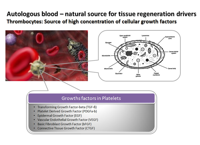 angiogenesis, collagenesis and matrix remodeling (PDGF/ TGF/ VEGF/ EGF/ FGF/ IGF etc).Autologous (from patient’s own blood).